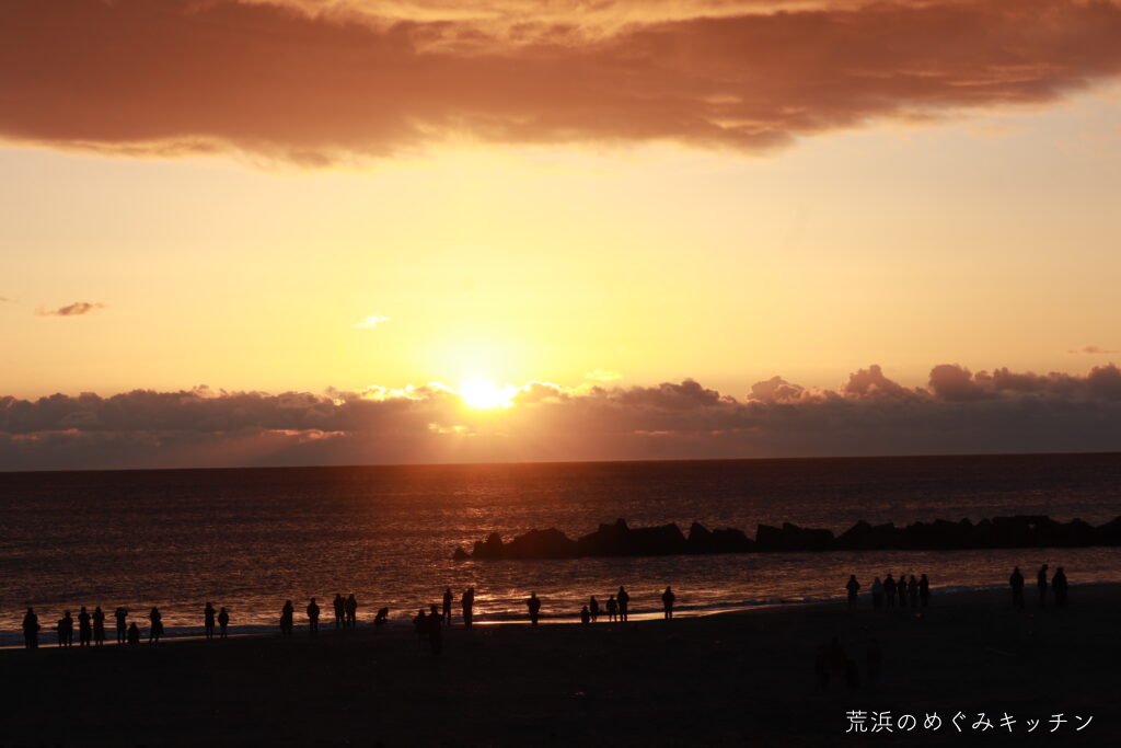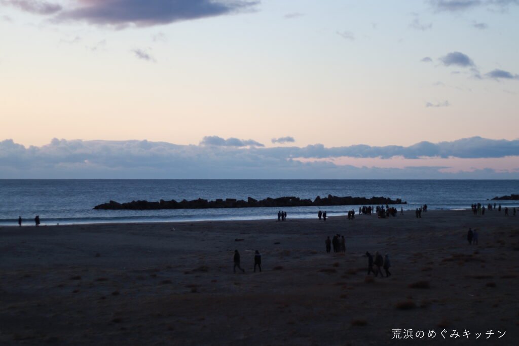 水平線が赤く染まりだし、初日を見ようと少しずつ海岸に集まる人たち。