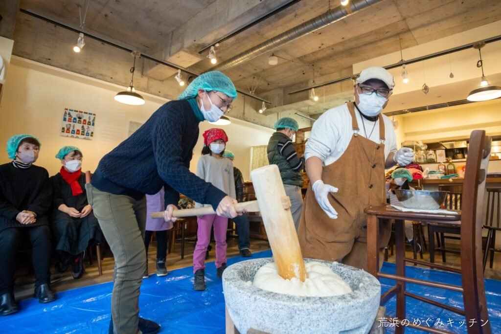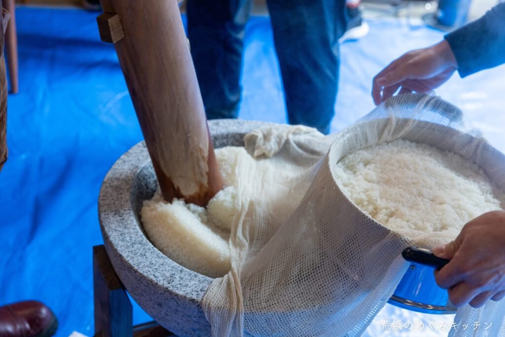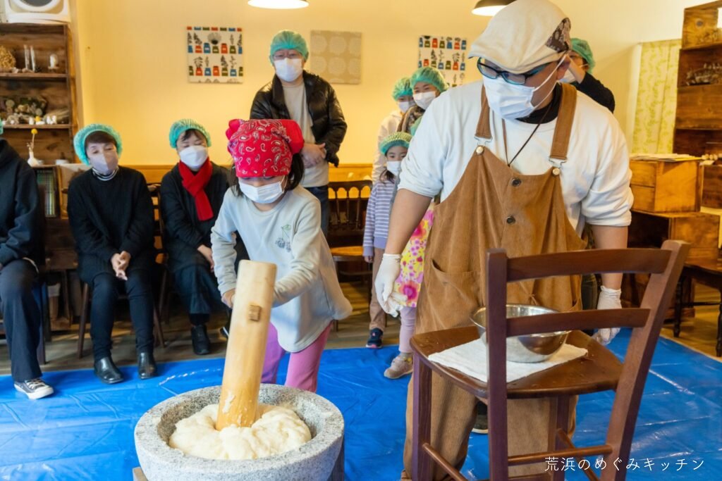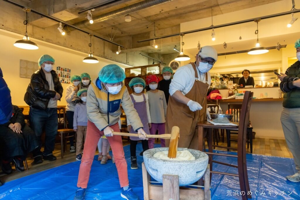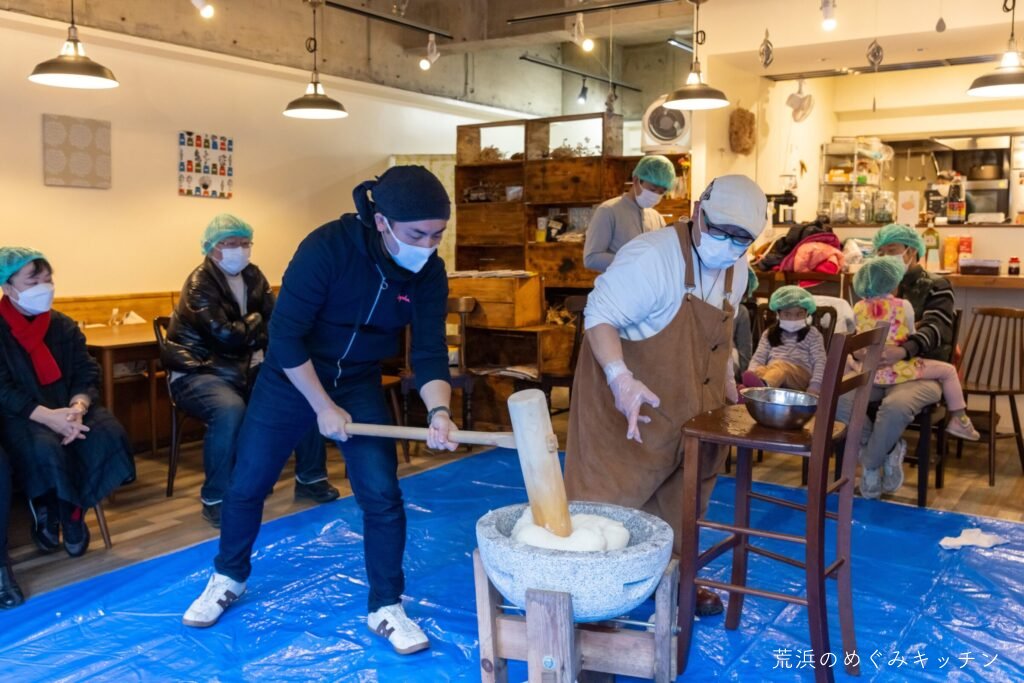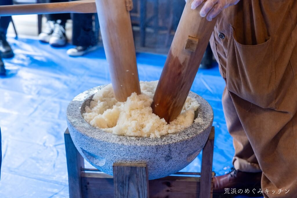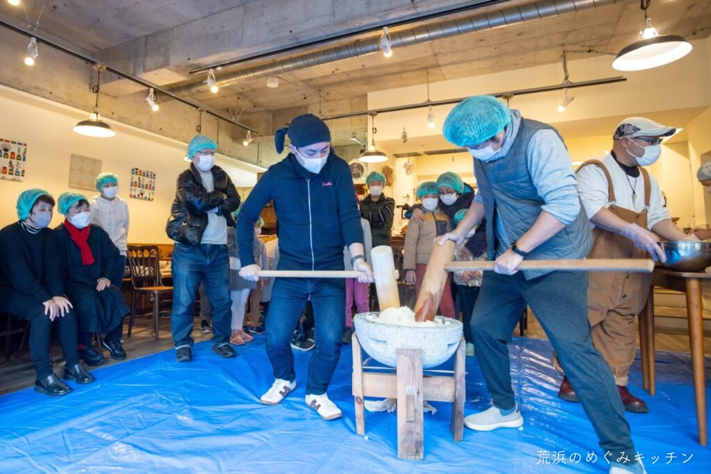 五橋ベース(綴カフェ)を会場に、荒浜の丸い田んぼで育った餅米でもちつき体験を行いました。