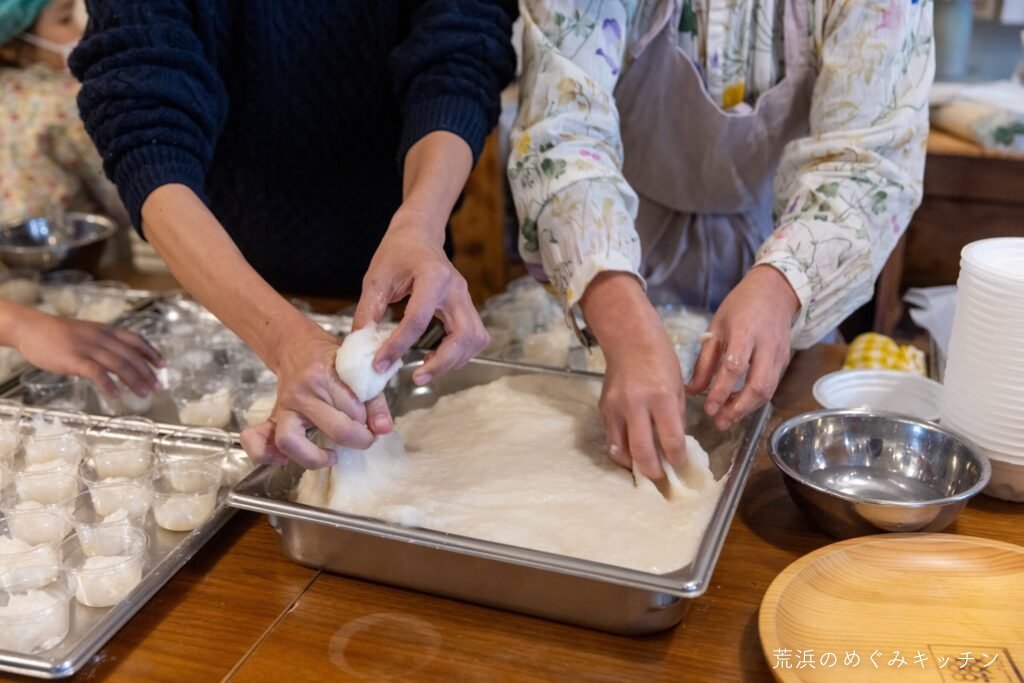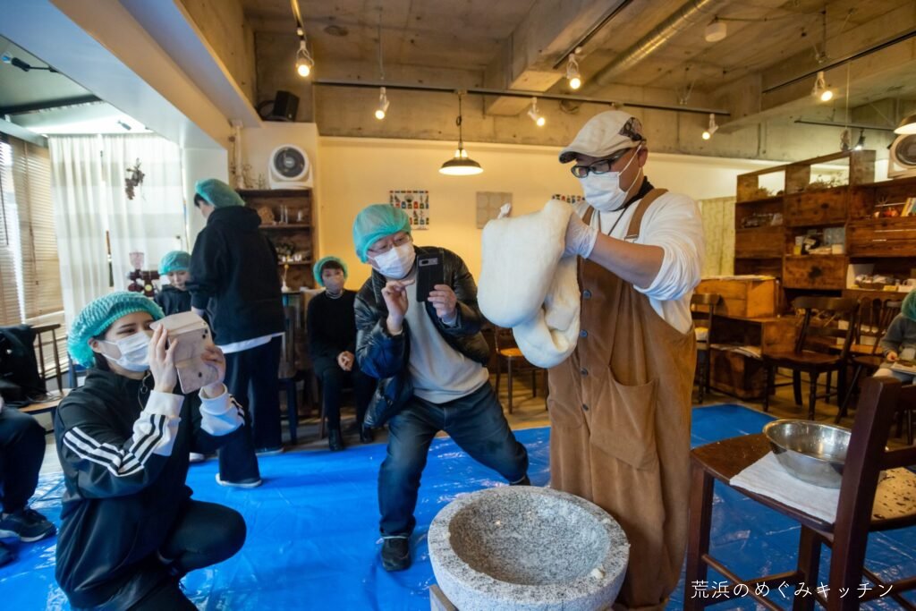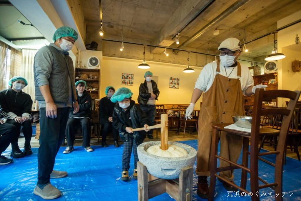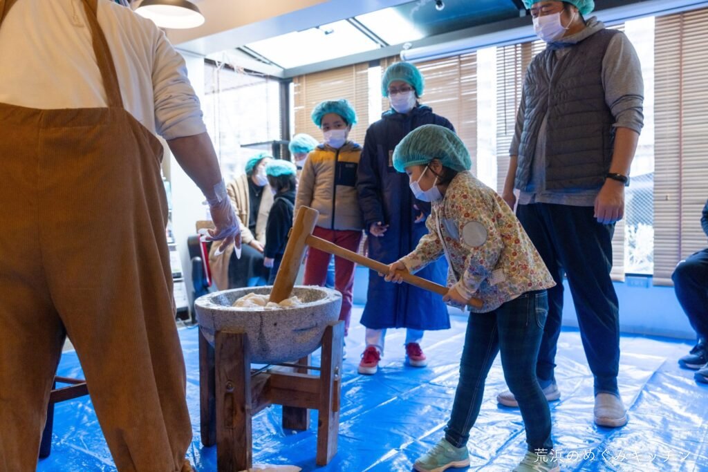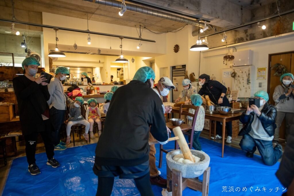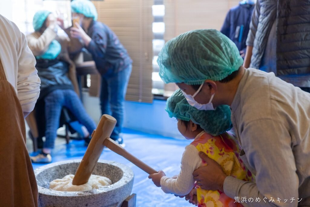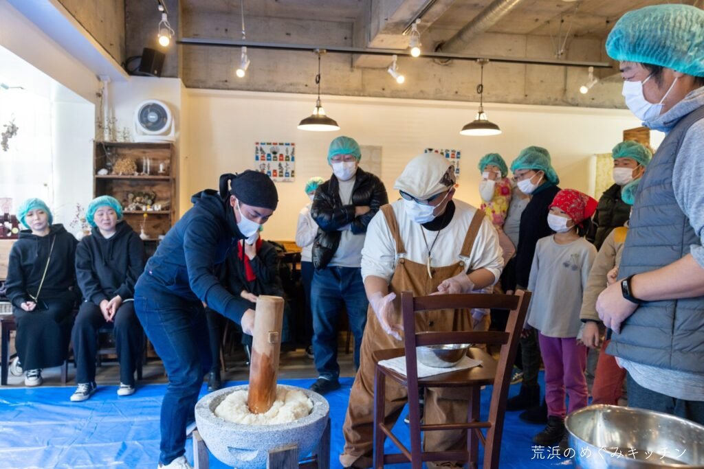 五橋ベース(綴カフェ)を会場に、荒浜の丸い田んぼで育った餅米でもちつき体験を行いました。