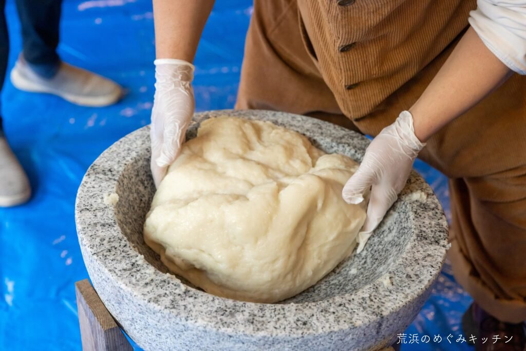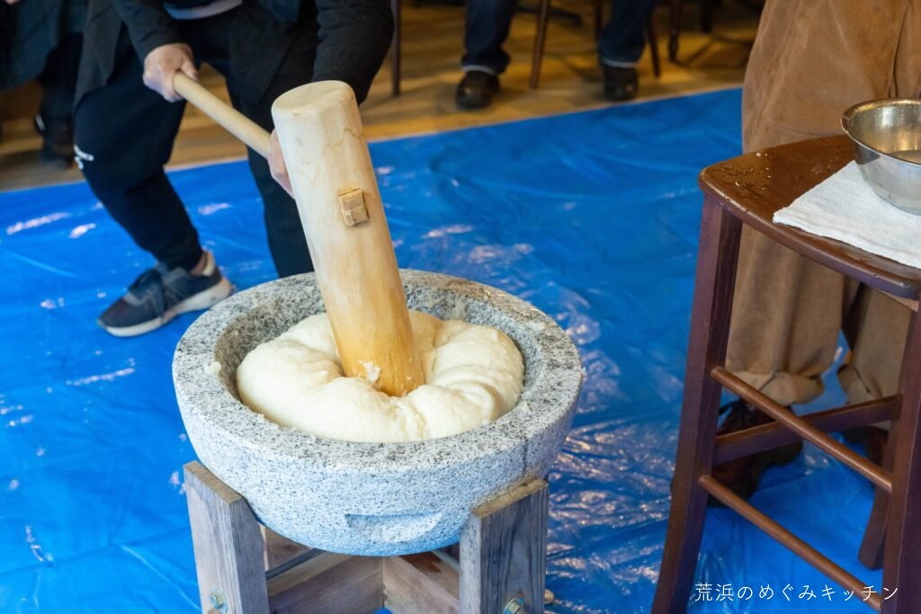 蒸し上がったお米を石臼に入れたら、もちつきの始まりです。まずは杵で粒を潰しながら捏ねていきます。この作業を手早くやるのが肝心。