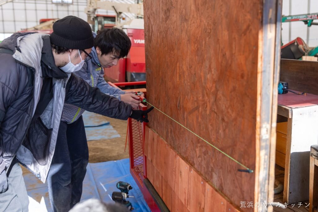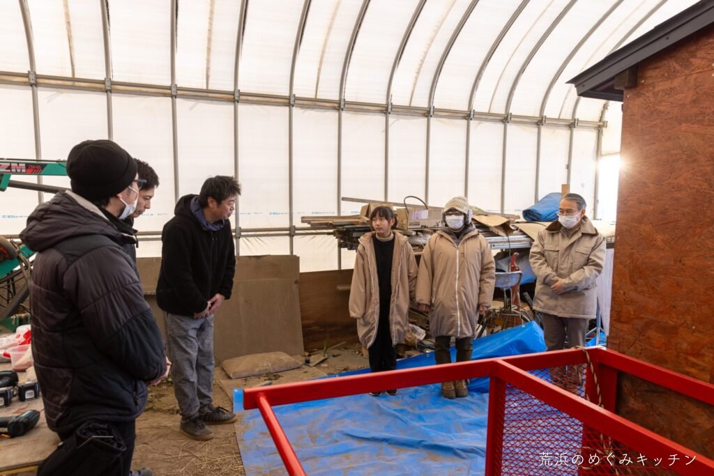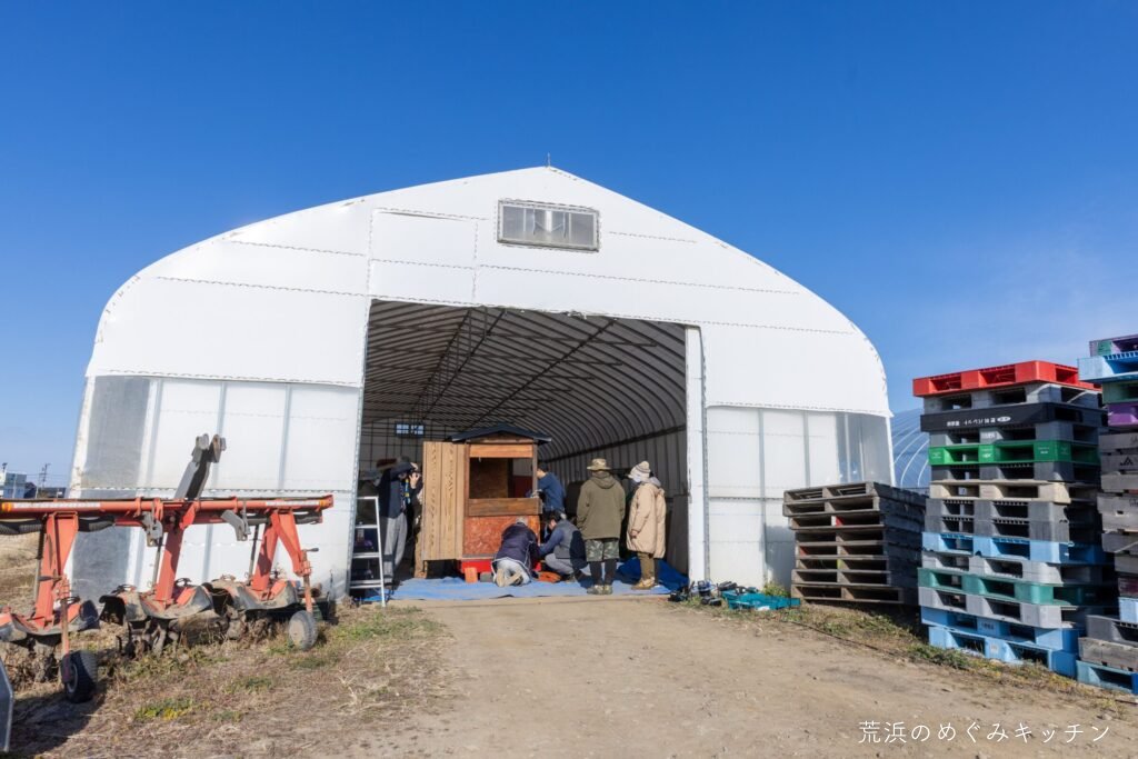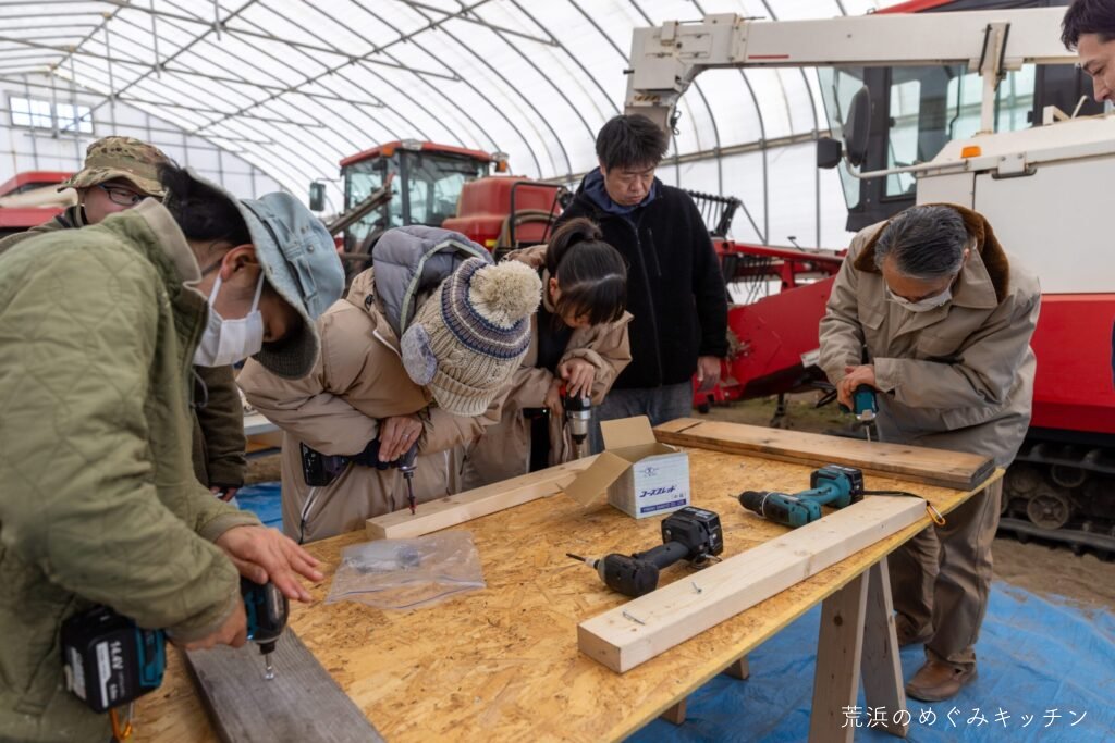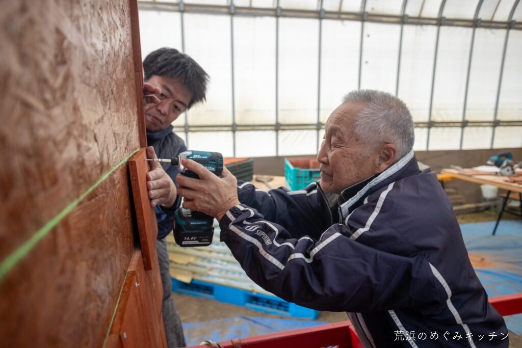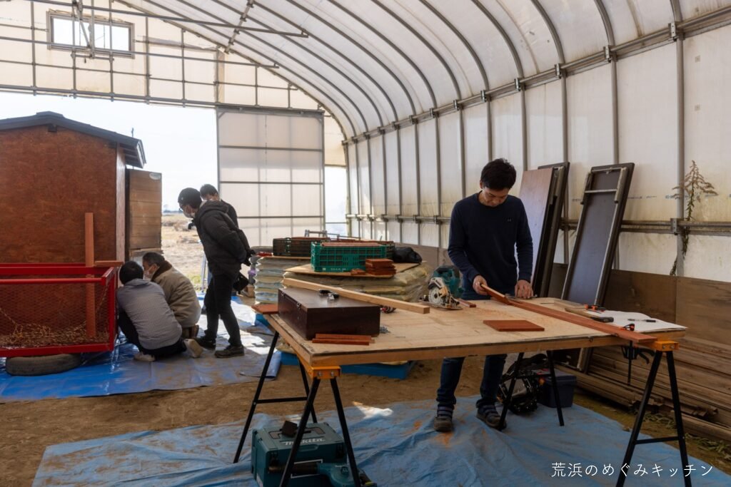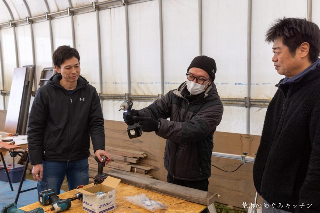 再び荒浜アグリパートナーズのハウスをお借りしての作業です。今回は、荒浜にもゆかりがあり、昨年度の屋台DIYワークショップや薪小屋を作る際など度々お世話になっているスリーエイトの渡邊さん、阿部さんにお越しいただきました。