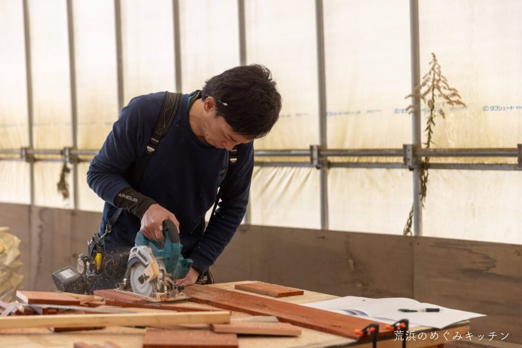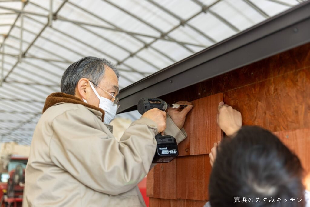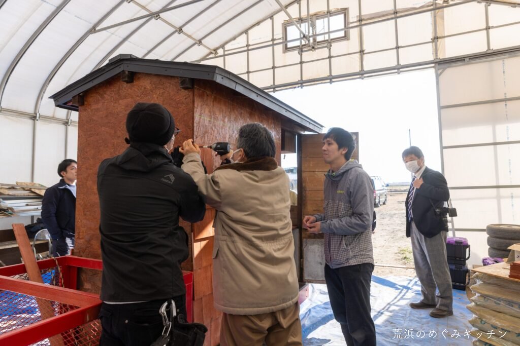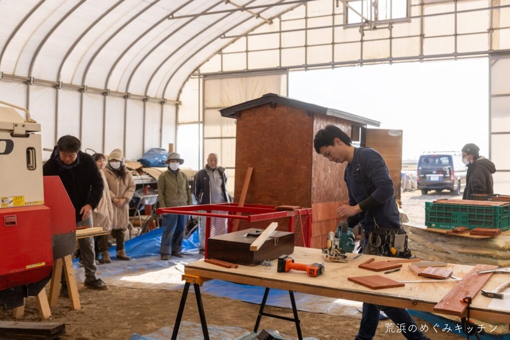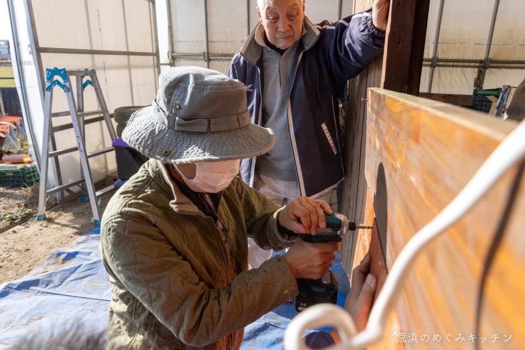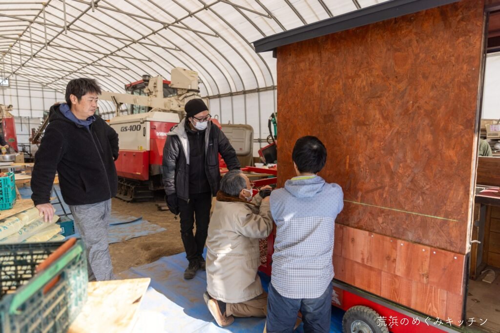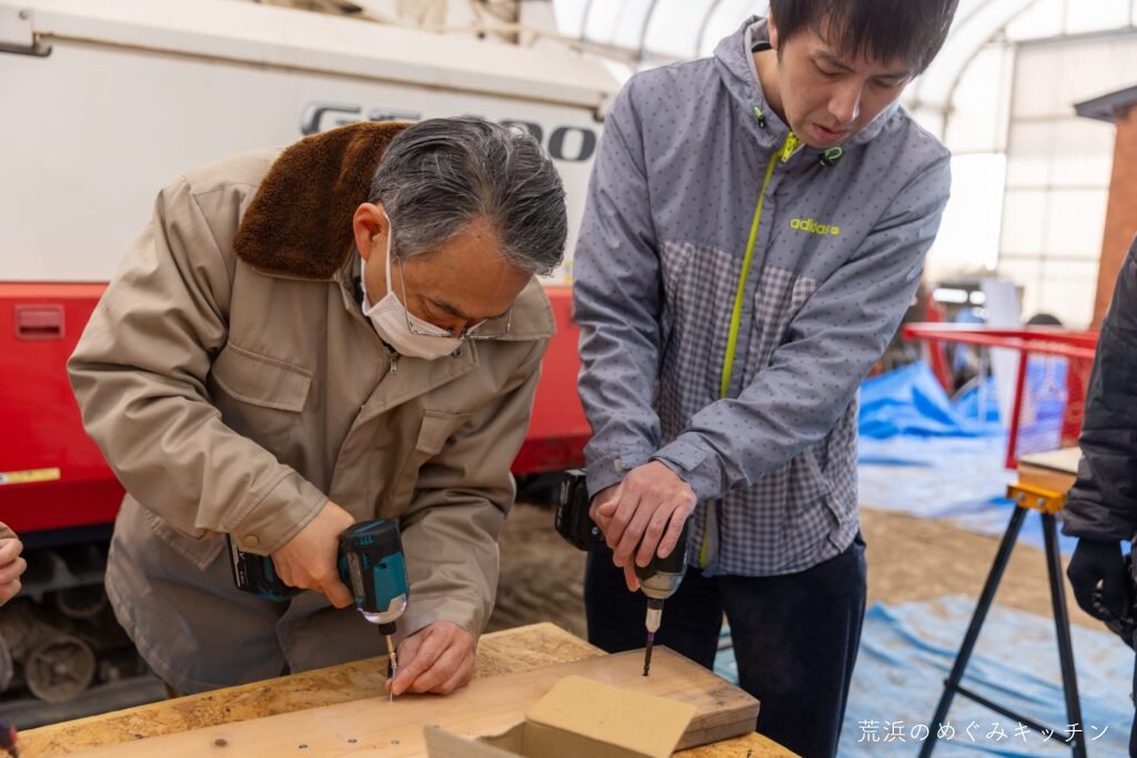 再び荒浜アグリパートナーズのハウスをお借りしての作業です。今回は、荒浜にもゆかりがあり、昨年度の屋台DIYワークショップや薪小屋を作る際など度々お世話になっているスリーエイトの渡邊さん、阿部さんにお越しいただきました。