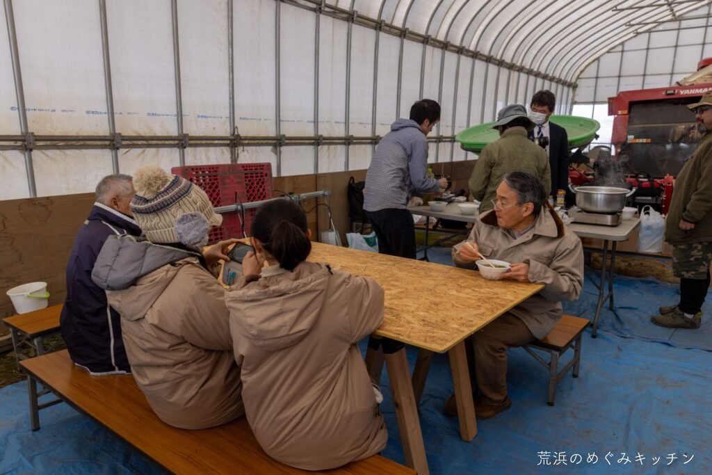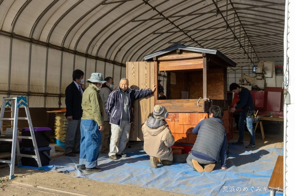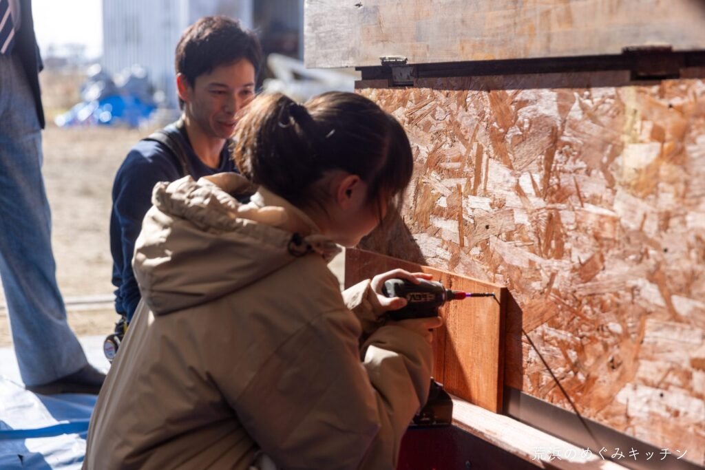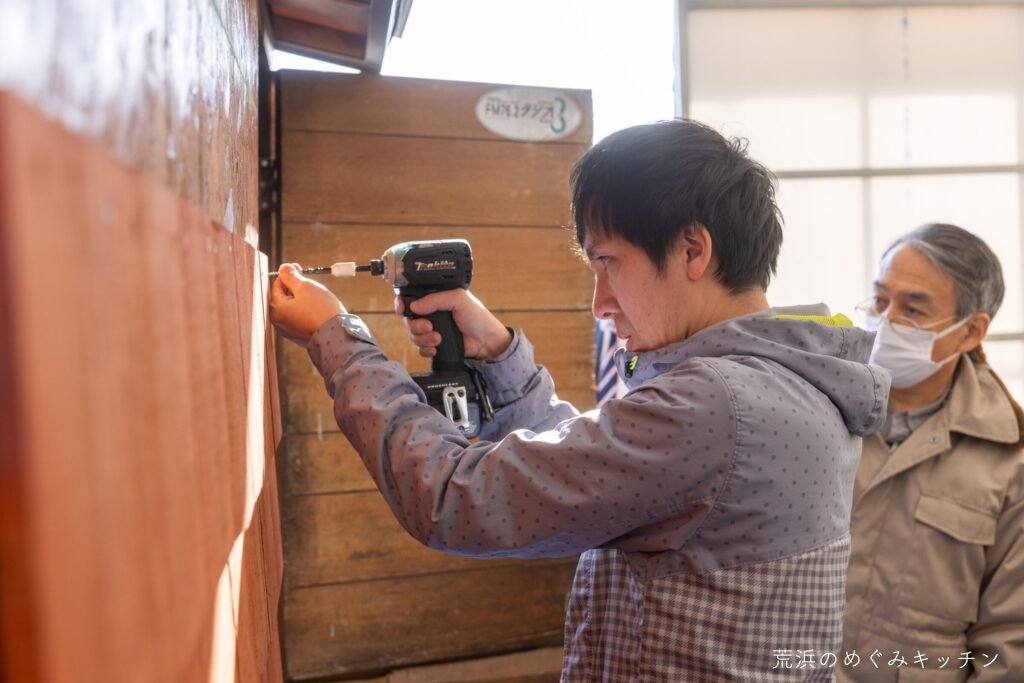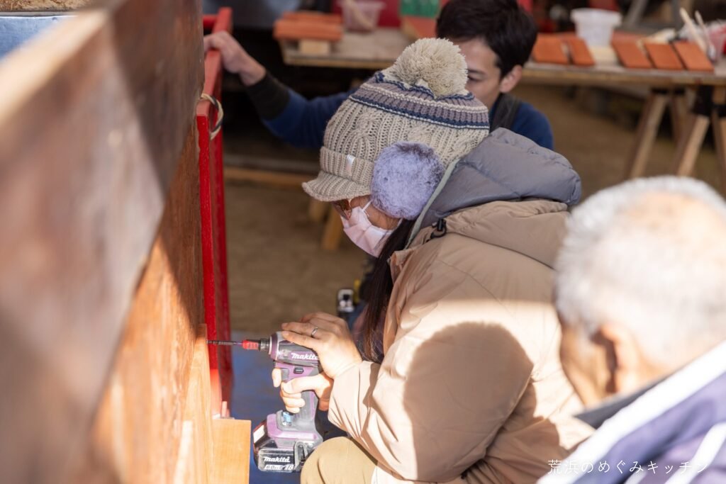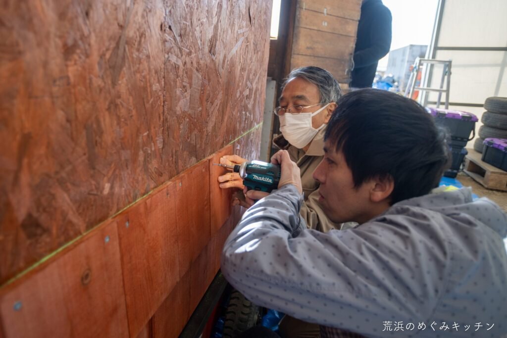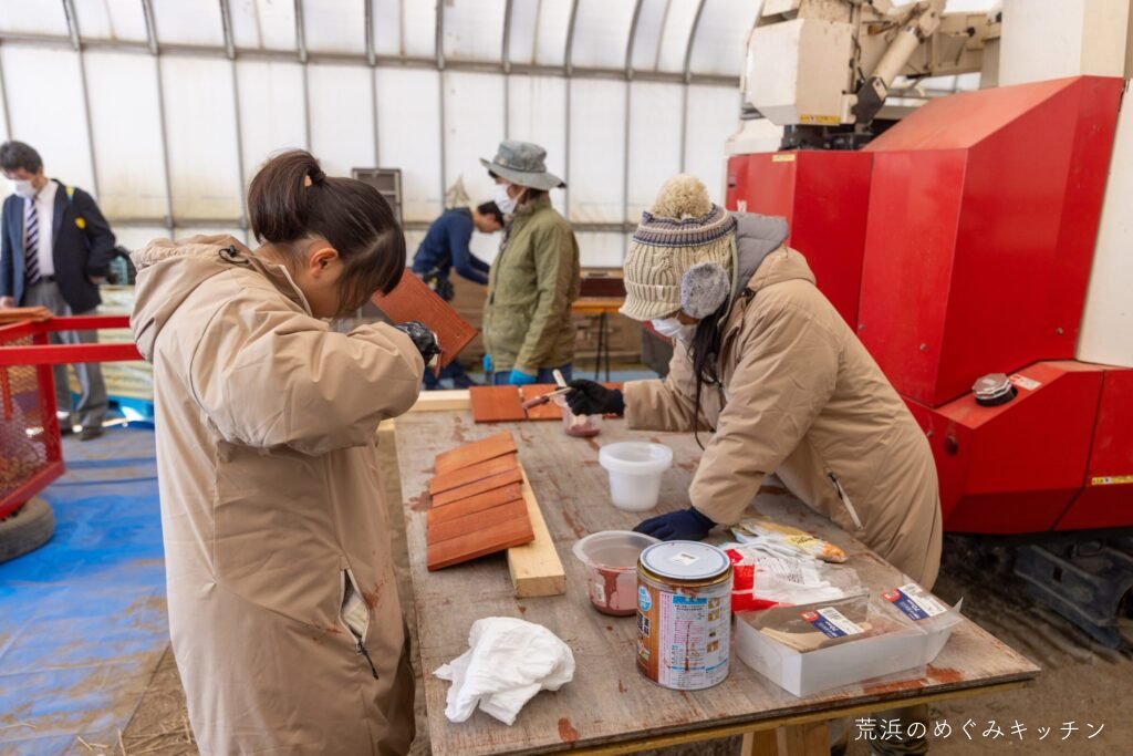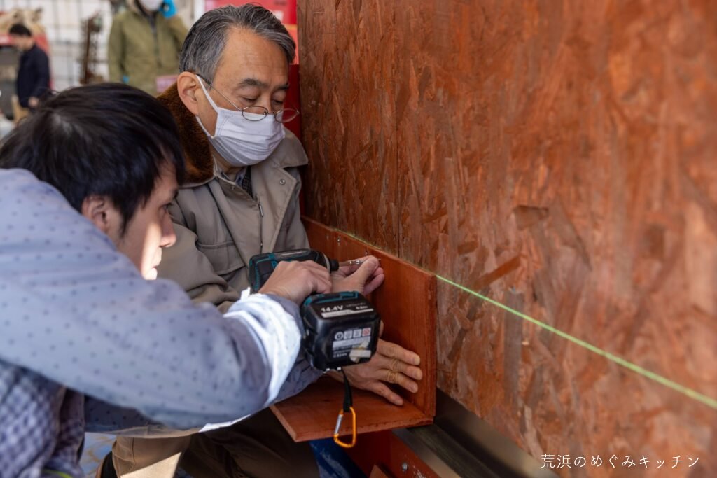 再び荒浜アグリパートナーズのハウスをお借りしての作業です。今回は、荒浜にもゆかりがあり、昨年度の屋台DIYワークショップや薪小屋を作る際など度々お世話になっているスリーエイトの渡邊さん、阿部さんにお越しいただきました。