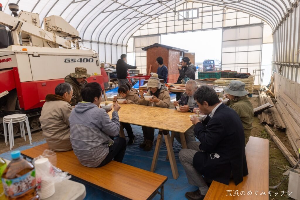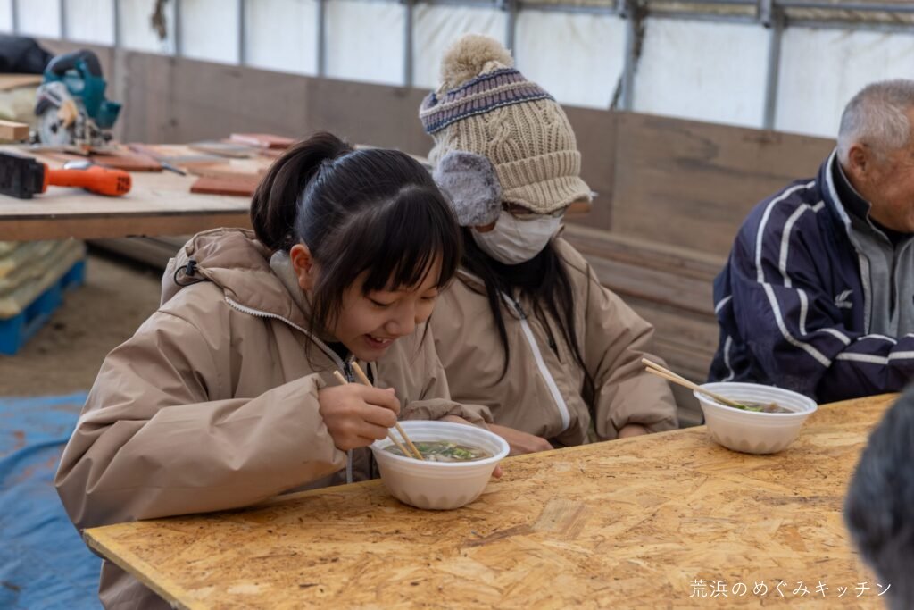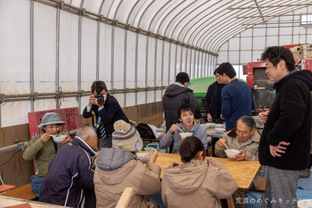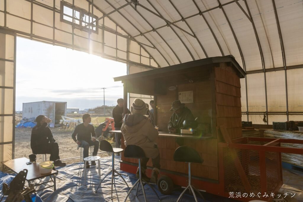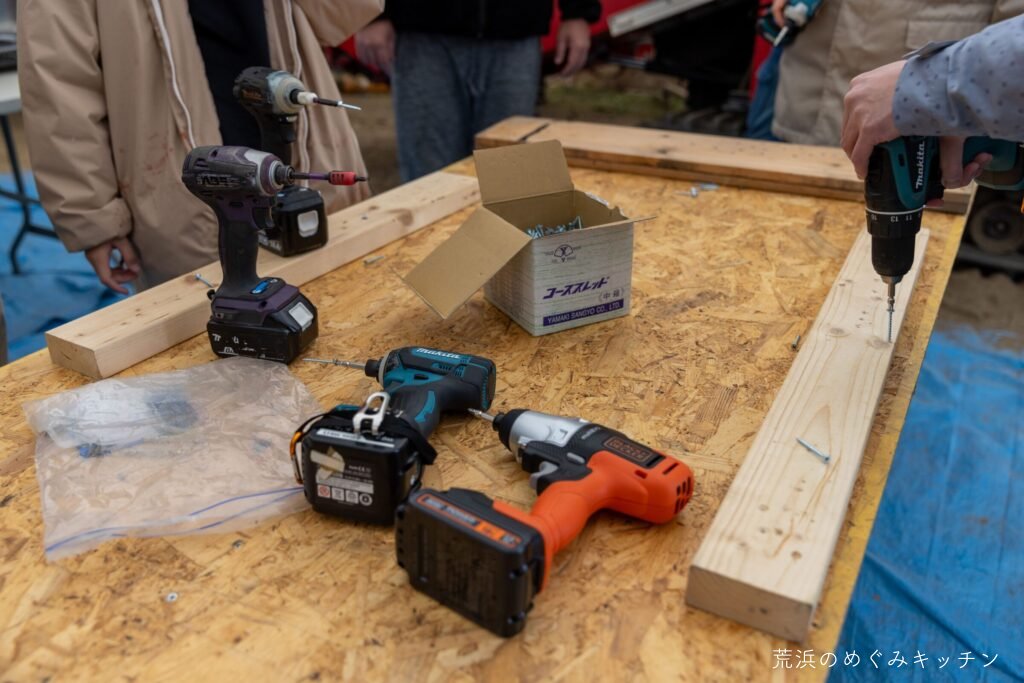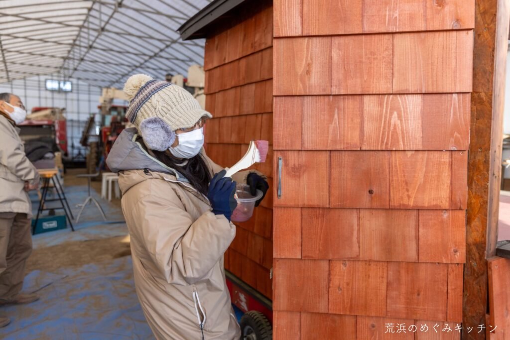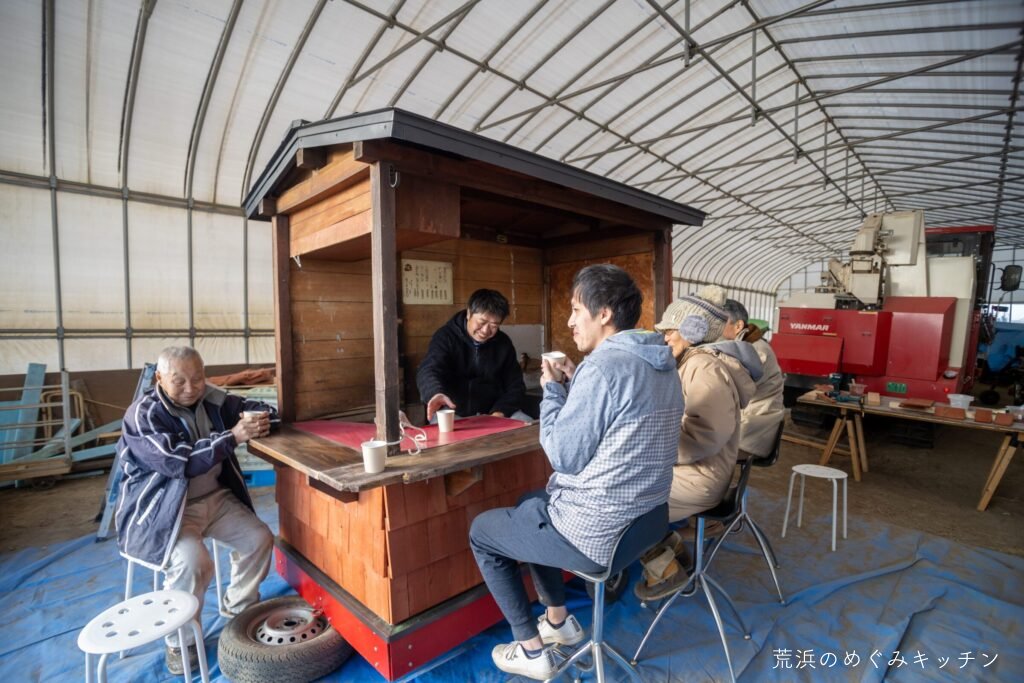 再び荒浜アグリパートナーズのハウスをお借りしての作業です。今回は、荒浜にもゆかりがあり、昨年度の屋台DIYワークショップや薪小屋を作る際など度々お世話になっているスリーエイトの渡邊さん、阿部さんにお越しいただきました。
