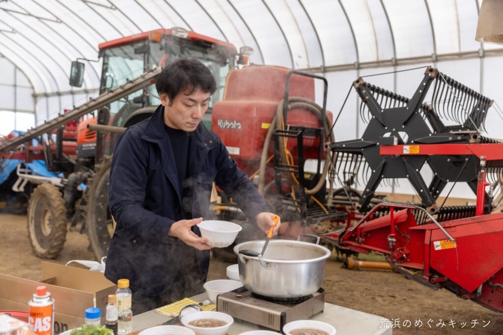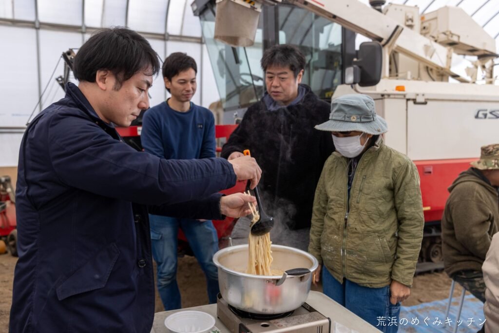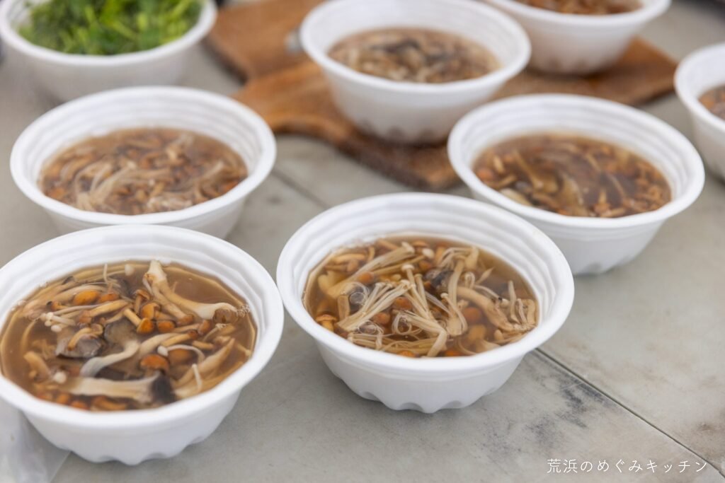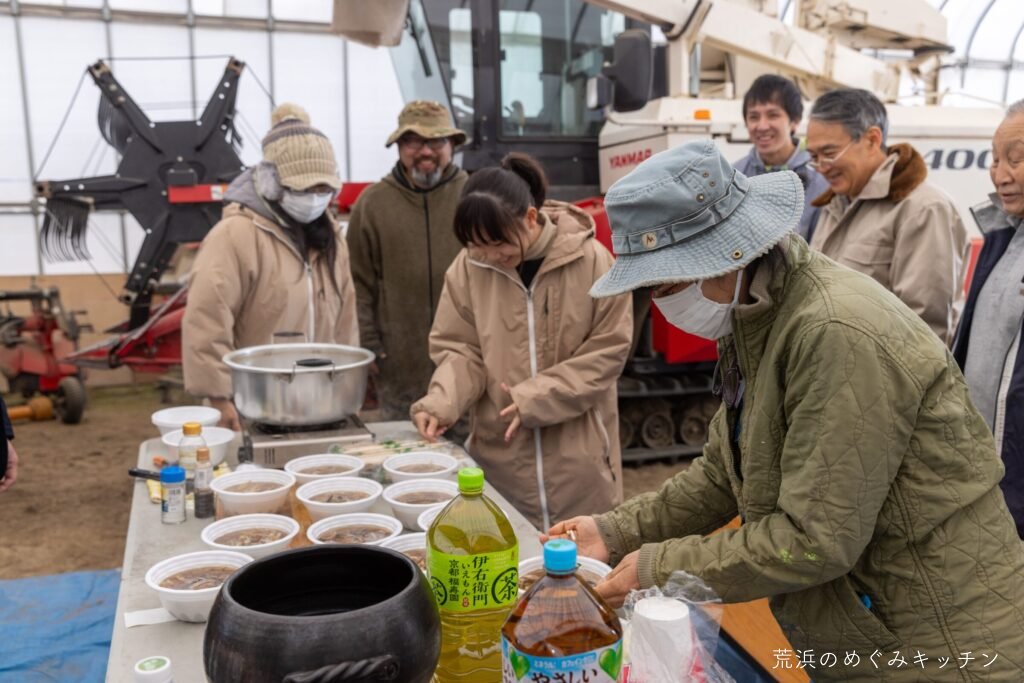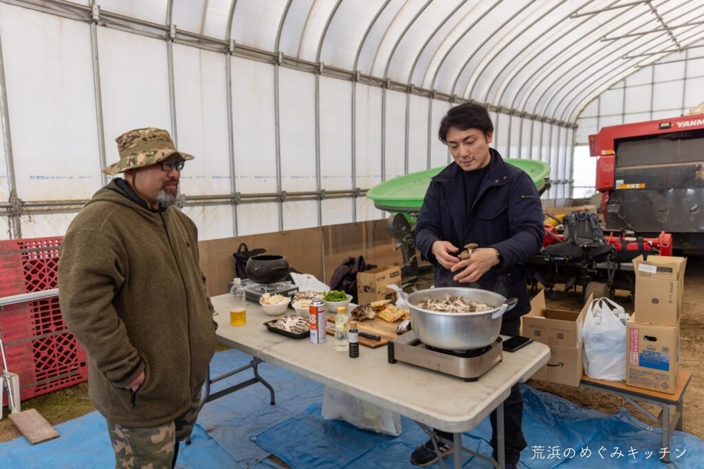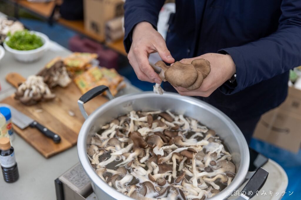 作業の横では昼食のキノコ汁の準備が進んでいます。荒浜では昔、食べられるキノコ類を「モダス」と呼んでいたそうです。かつて海岸に生い茂っていた松林で採れたという、豊富な種類のキノコの姿や味を想像しながら、今回は市販の4種のキノコを鍋で煮ていきます。