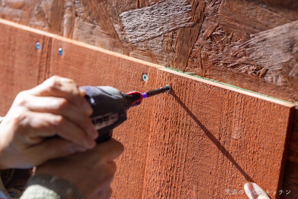 一つひとつ、位置合わせをしながらビスを打ち込んでいくので、一枚とめるのにもけっこう時間がかかります。職人さんはほんの数秒でやってしまうので、参加された方からは「簡単そうに見えるんだけどなぁ!(笑)」という声。