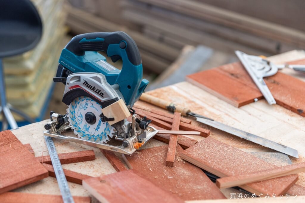 端の方では板幅の微調整が必要なので、随時カットしながら進めていきます。切断面の仕上げには、防腐塗料も忘れずに塗り込みます。