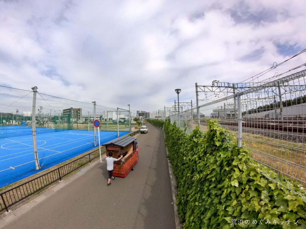 地下鉄東西線の終点、荒井駅の近くを会場に行われる「ぐるぐるフェスティバル」。その会場のひとつ「荒井東1号公園」へ、これまでのワークショプで修繕してきた荒浜屋台を連れて出掛けてきました。