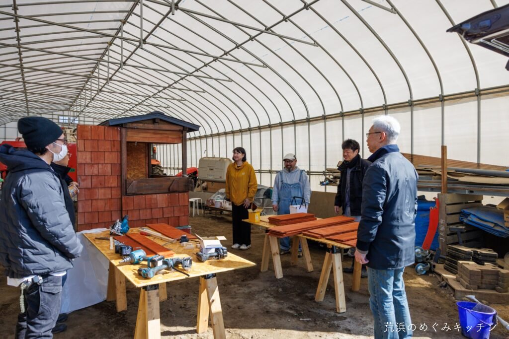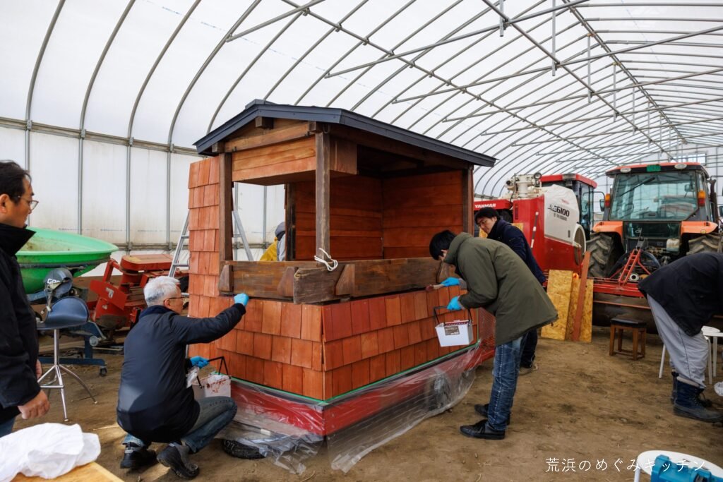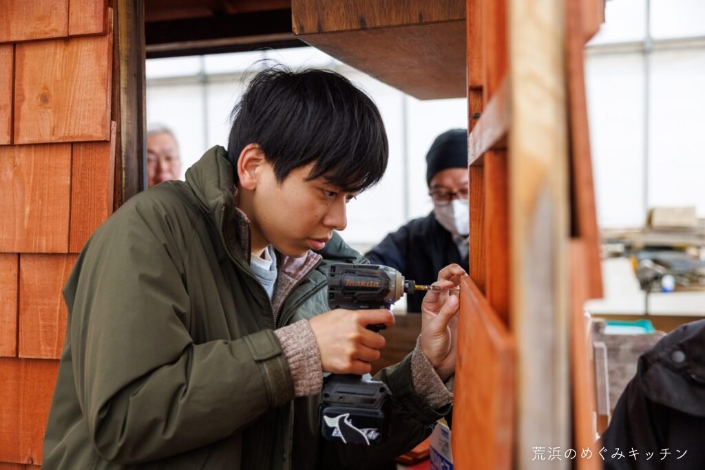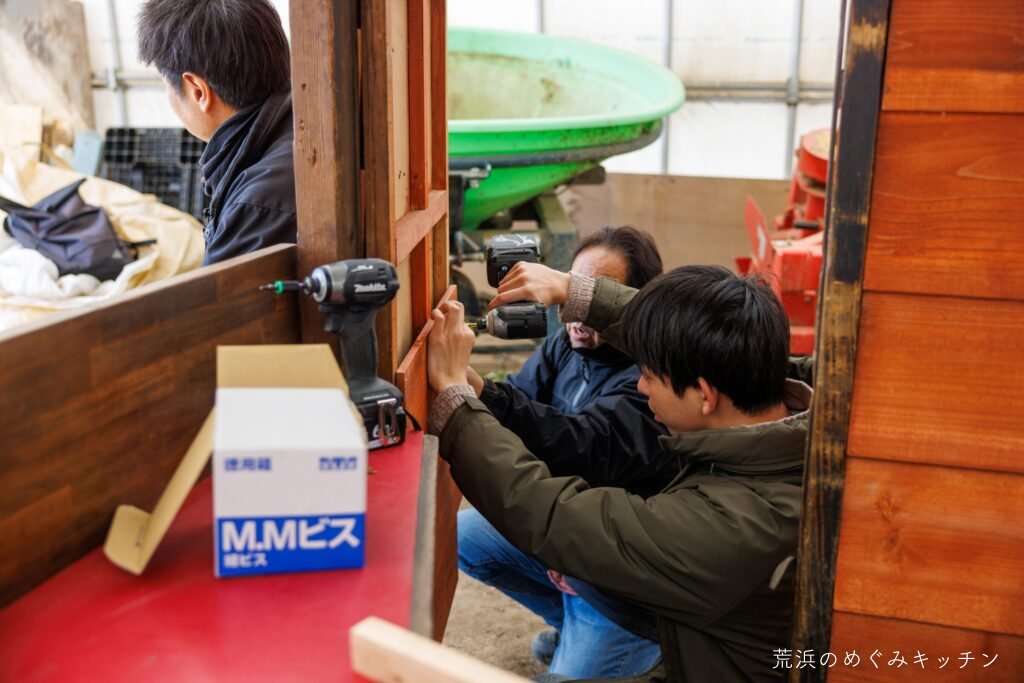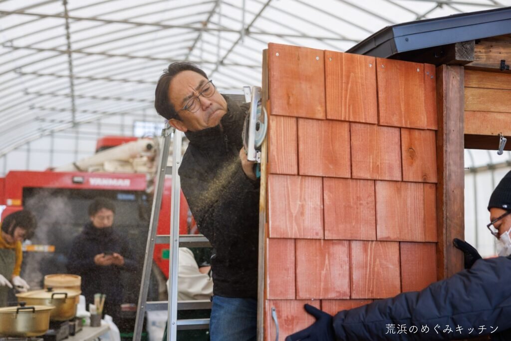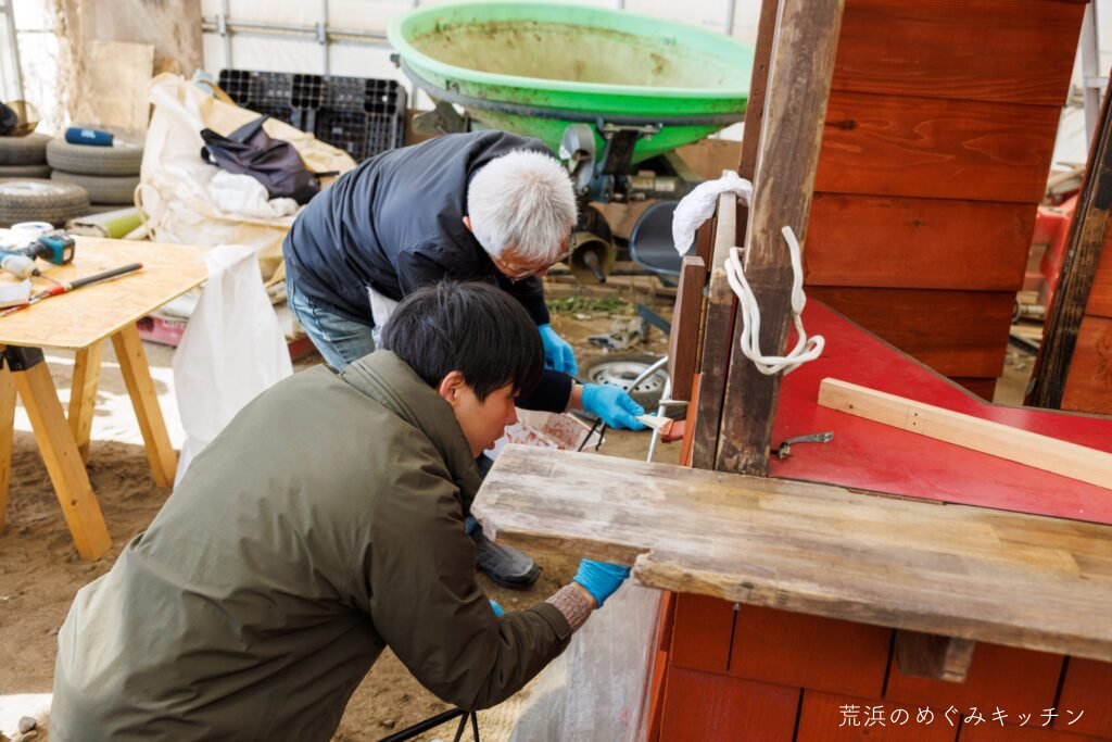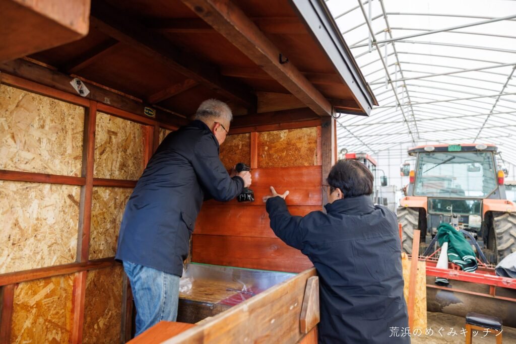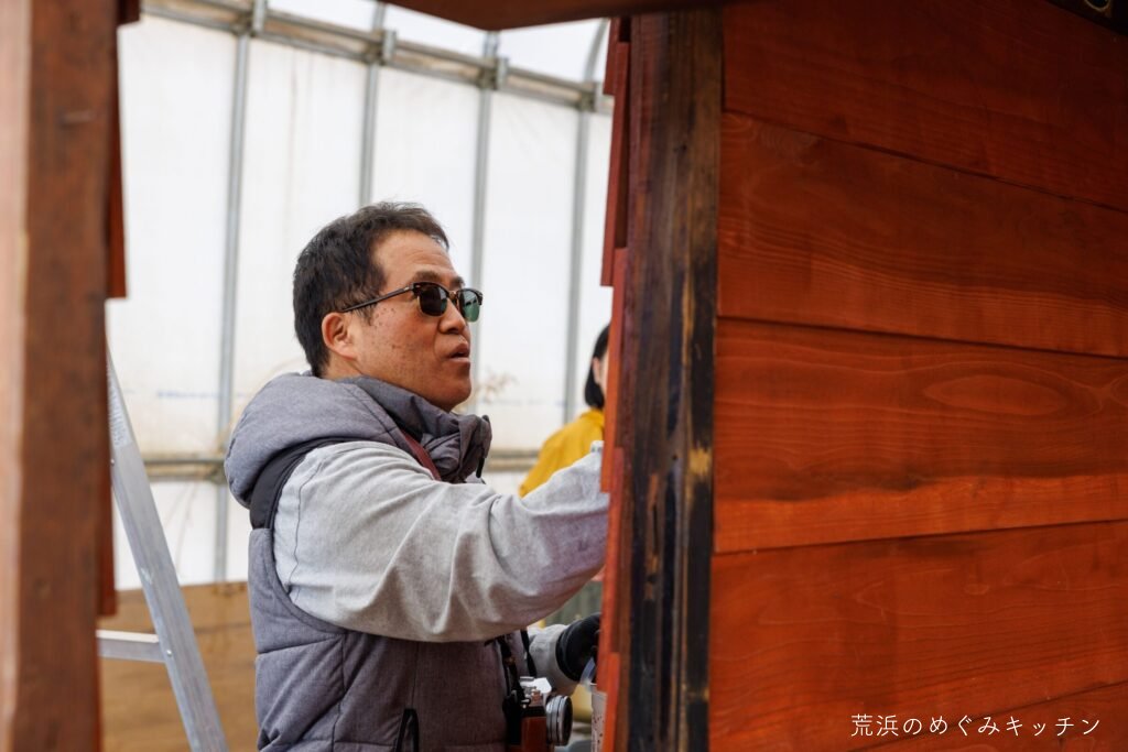 荒浜ベースにある屋台をDIYで修理するワークショップを今年も開催しました。今日の作業は、内壁の貼り付けと外壁の塗り直し。
